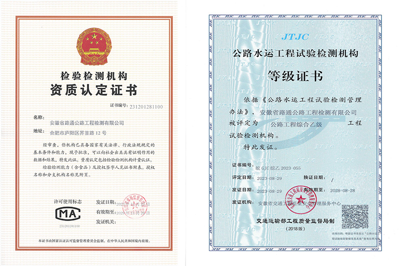 安徽省路通公路工程檢測有限公司成立于2003年7月?,F擁有公路工程綜合乙級檢測資質、排水管道檢測及評估作業能力III級作業證書,并通過了檢驗檢測機構資質認定。2021年12月16日,獲批“高新技術企業”。各專業試驗檢測人員配備齊全,具備開展集料、鋼材、土工、瀝青及瀝青混合料、水泥及水泥混凝土、砂漿、無機結合料、水、外加劑、磚以及路基路面、混凝土結構物、基坑地基與基樁、橋梁結構、交安設施、公路與橋梁技術狀況和城鎮排水管道檢測等多項試驗檢測的能力。