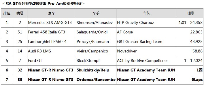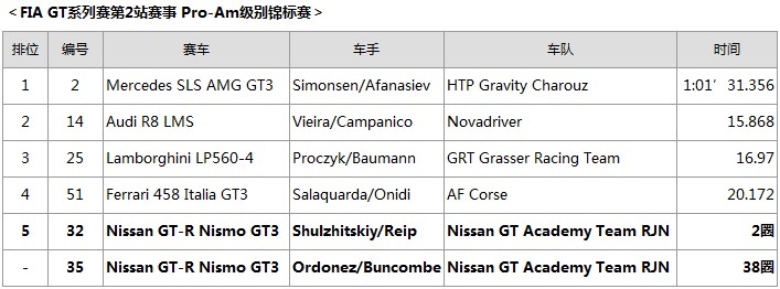 來自比利時(shí)的Wolfgang LAIB和來自俄羅斯的隊(duì)友Mark Shulzhitskiy在預(yù)賽中從第17位的位置起步,中途成功避開各種事故,最終獲得第15名。在決賽中,Mark Shulzhitskiy在首圈中就陷入激烈的競(jìng)爭(zhēng)中,但是,當(dāng)他駕駛#32 NISSAN GT-R NISMO GT3賽車擺脫其他賽車進(jìn)站維修并重返賽道后,他開始恢復(fù)至原來的圈速,接手的Wolfgang LAIB最終獲得綜合成績(jī)第4名,在Pro-Am級(jí)別中名列第5。