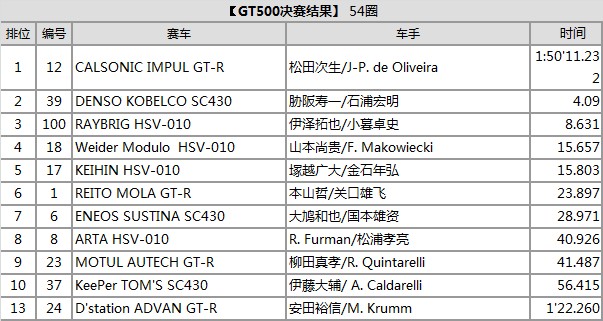 決賽的熱身圈在下午4時舉行,跑1圈后進行動態(tài)發(fā)車。確定好各車的發(fā)車順序后,各賽車紛紛沖至第一彎道。12# GT-R賽車的首發(fā)車手是松田次生。處于領先位置的松田次生一邊觀察后方賽車的情況一邊采取穩(wěn)健的策略。決賽的熱身圈在下午4時舉行,跑1圈后進行動態(tài)發(fā)車。確定好各車的發(fā)車順序后,各賽車紛紛沖至第一彎道。12# GT-R賽車的首發(fā)車手是松田次生。處于領先位置的松田次生一邊觀察后方賽車的情況一邊采取穩(wěn)健的策略。雖然松田次生采取穩(wěn)步前進的策略,但在第18圈時不小心給予對手可乘之機,從而丟失了頭名。但是,在第25圈進站維修與Oliveira交接賽車之后,由于18# HSV賽車駛出維修站再次發(fā)動時耗費了較多時間,12# GT-R賽車再次成為領頭羊。之后Oliveira保持穩(wěn)健的節(jié)奏,再沒給對手超越的機會,在第54圈時率先沖過終點。