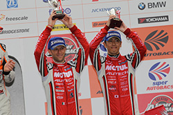 另外,Ronnie Quintarelli以預(yù)賽第11名的成績(jī)駕駛#23 GT-R起步。在前半程賽事中,持續(xù)與#24 GT-R展開(kāi)激烈競(jìng)爭(zhēng),因此加速了輪胎的磨損。在第19圈的彎道頂點(diǎn)中一舉超越#24 GT-R,使得排位上升至第8位。在第30圈時(shí)為交接賽車(chē)和更換輪胎,Ronnie Quintarelli駕駛賽車(chē)進(jìn)入維修站。柳田真孝駕駛賽車(chē)重返賽道后,由于前方賽車(chē)剮蹭等導(dǎo)致某些情況變動(dòng),另外加上降雨,使得賽道出現(xiàn)混亂情況。盡管如此,順利跑圈的#23 GT-R一鼓作氣將排位提升至第6位。在臨近賽事結(jié)束時(shí),由于處于第一集團(tuán)的賽車(chē)出現(xiàn)打滑等現(xiàn)象導(dǎo)致掉隊(duì),#23 GT-R在第81圈時(shí)奮勇沖過(guò)終點(diǎn),最終奪得第3名。另外,以預(yù)賽第9名的成績(jī)起步的#24 D'station ADVAN GT-R(安田裕信/Michael Krumm)由安田裕信擔(dān)任首發(fā)車(chē)手,安田裕信一直保持穩(wěn)定的節(jié)奏堅(jiān)守排位,在第30圈進(jìn)站維修時(shí)與Michael Krumm進(jìn)行了賽車(chē)交接。Michael Krumm負(fù)責(zé)較長(zhǎng)賽道(負(fù)責(zé)圈數(shù)),最終奪得第5名。他感慨地說(shuō):“比賽臨近尾聲時(shí)下雨,我駕車(chē)進(jìn)站維修并更換了輪胎,面對(duì)半濕的路面輪胎充分發(fā)揮了性能,最終我以第5名的成績(jī)完成比賽,感覺(jué)很好?!?/span>