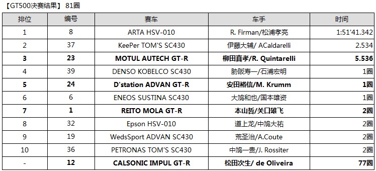 本周末東北地區(qū)經(jīng)常發(fā)出大雨警報(bào),天氣一直不好,因此預(yù)測(cè)將導(dǎo)致決賽過(guò)程出現(xiàn)混亂局面。但是,一直到?jīng)Q賽前一天久圍不散的大霧終于散去,決賽當(dāng)日早上進(jìn)行自由行駛時(shí)開(kāi)始,路面也早已變干。下午兩點(diǎn)決賽開(kāi)始時(shí),氣溫接近30度,天氣相當(dāng)不錯(cuò)。在正式預(yù)賽中奪得GT500級(jí)別桿位的1 REITO MOLA GT-R(本山哲/關(guān)口雄飛)由關(guān)口雄飛擔(dān)任首發(fā)車(chē)手,關(guān)口雄飛應(yīng)對(duì)后方競(jìng)爭(zhēng)對(duì)手挑戰(zhàn)的同時(shí)控制賽車(chē)跑圈,在這過(guò)程中未出現(xiàn)絲毫失誤,專(zhuān)心承擔(dān)起將賽車(chē)順利交接給負(fù)責(zé)下半程賽事的本山哲的重任。在第40圈進(jìn)站維修并與本山哲交接賽車(chē)時(shí),之前處于第2位的#30 LEXUS SC430首先完成加油操作,一舉實(shí)現(xiàn)了數(shù)秒之差的逆轉(zhuǎn)。雖然本山哲努力尋找再次逆轉(zhuǎn)的戰(zhàn)機(jī),但在#1 GT-R之前駛出維修站的#38 LEXUS SC430插入兩者之間,本山哲為了盡早挽回排位而展開(kāi)了激烈的競(jìng)爭(zhēng)。兩輛賽車(chē)展開(kāi)了攻防大戰(zhàn),數(shù)次幾乎要發(fā)生接觸剮蹭,在第47圈的第一個(gè)彎道上,雖然本山哲發(fā)動(dòng)猛烈攻勢(shì),但駕駛#38 SC430的立川祐路卻絲毫不讓?zhuān)旧秸苁?duì)賽車(chē)控制導(dǎo)致賽車(chē)偏出跑道。此時(shí)由于沖擊導(dǎo)致輪胎受損,最后本山哲不得不駕駛賽車(chē)進(jìn)站維修并退出比賽。
